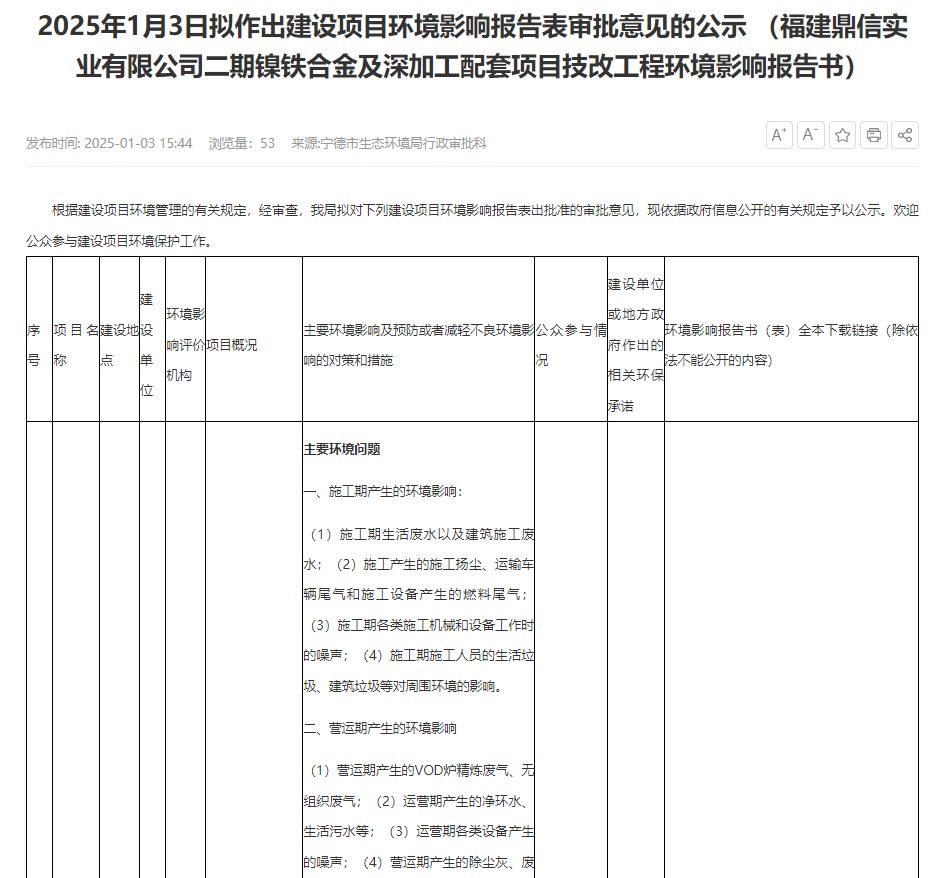 2025年1月3日,寧德市生態(tài)環(huán)境局就福建鼎信實業(yè)有限公司二期鎳鐵合金及深加工配套項目技改工程環(huán)境影響報告書作出審批意見并對外進行公示,公示時間:2025年1月3日-2025年1月9日(5個工作日)。